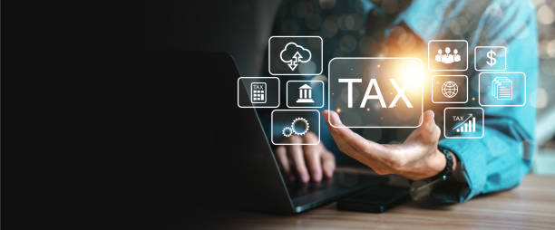 Businessman using computer to fill out income tax refund form Enter the online tax form to pay taxes. state tax government Data analysis, documents, financial research, reports, tax return calculation concepts.